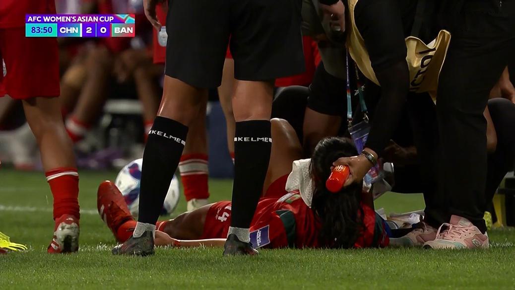 下半场回来,双方都进行了人员调整,孟加拉女足将阵型改为四后卫,增加前场的攻势。第59分钟,谢宗梅连续被对手铲抢,是一个明显的点球,但是裁判直接选择无视!